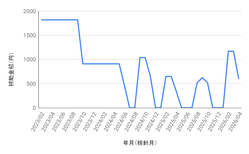これまでに何度か実施されている電気・ガス料金支援事業の補助金は、最初に実施された「電気・ガス価格激変緩和対策事業」以降、実施されるごとに補助金額が縮小されてきています。以下のグラフは、2023年2月検針(1月使用分)以降の補助金額の推移をまとめたものです。
